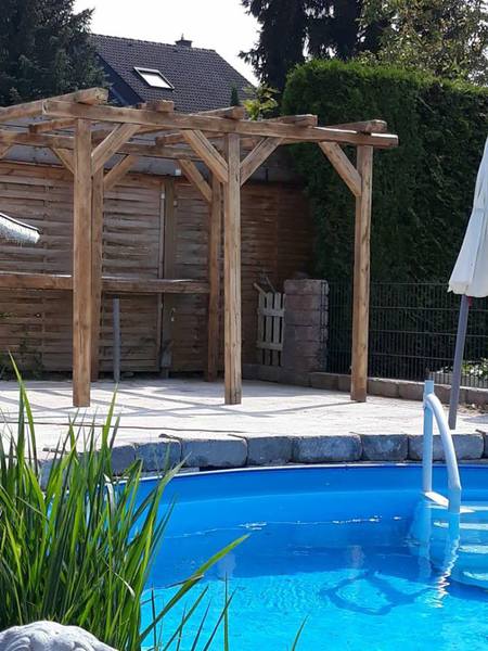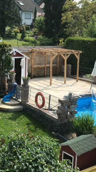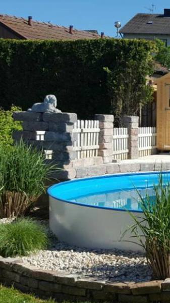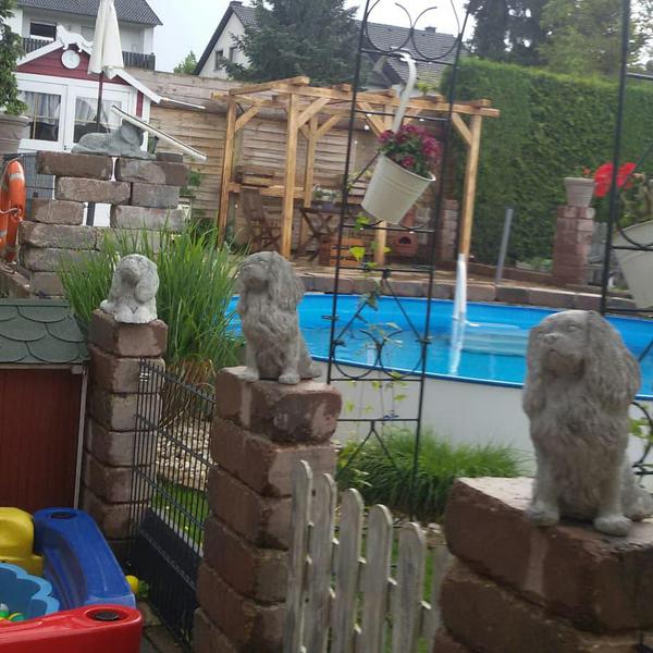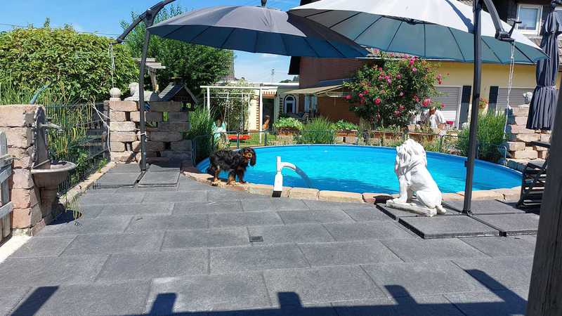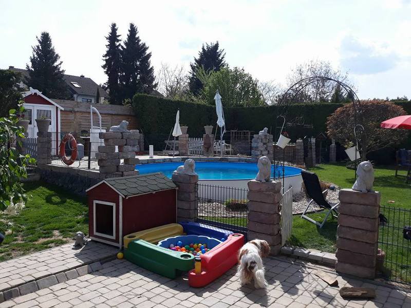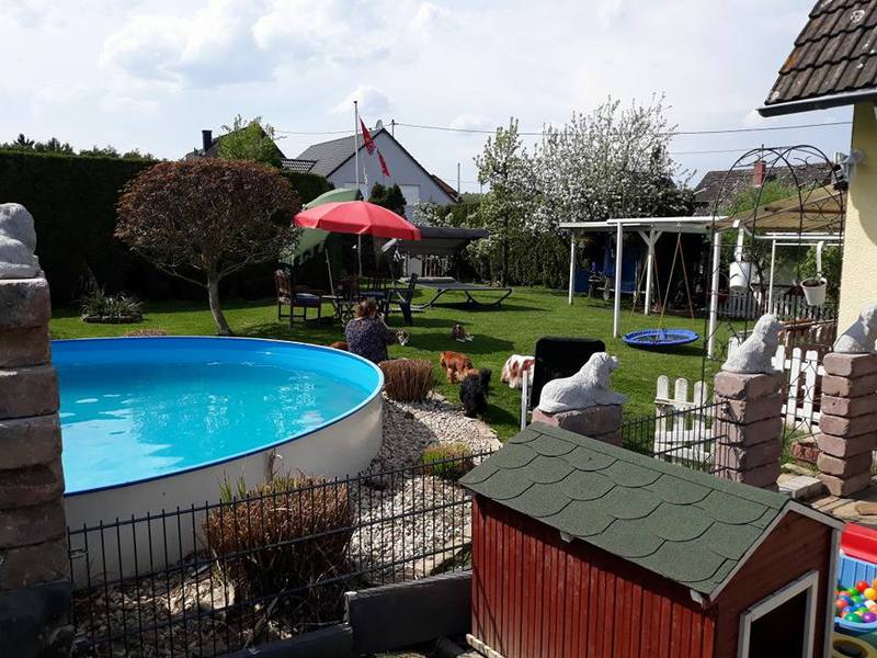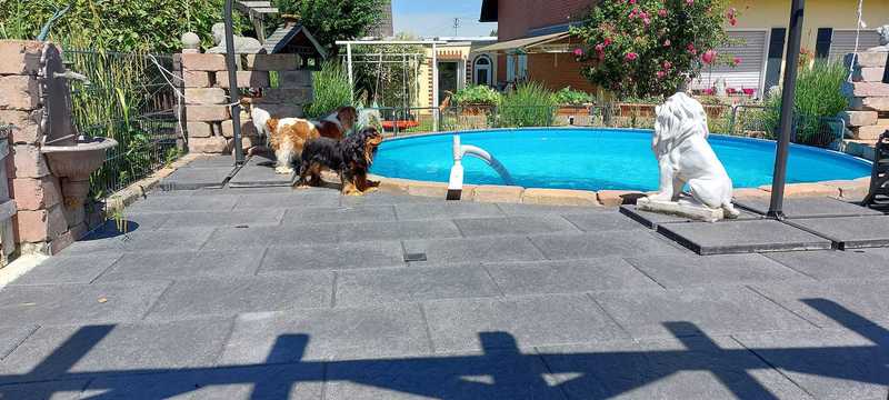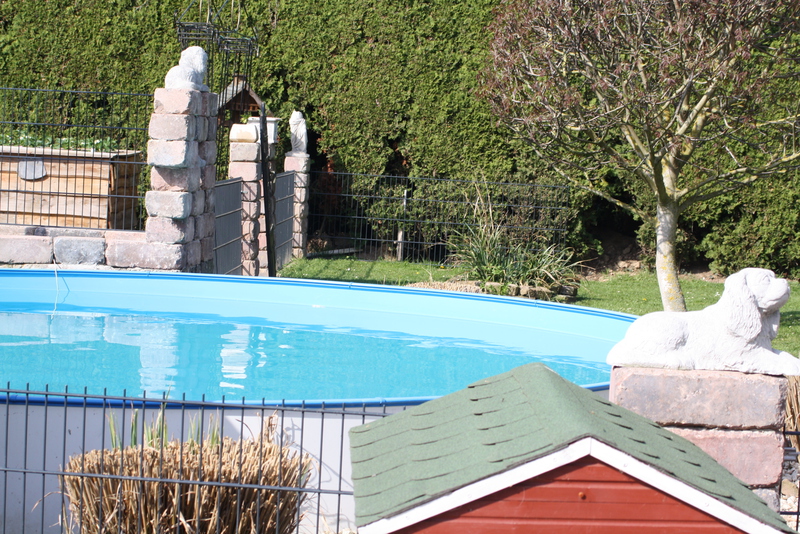 Für uns und die Hunde ein Paradies, ohne Garten hätten wir nie mit der Zucht angefangen, da sie sich von Morgens bis Abends hier austoben können, die Welpen laufen ab der 5.Woche schon durch den ganzen Garten mit den Großen mit und haben vor nichts Angst. Wir haben das Glück das wir so viel Platz haben(so groß muss ja auch nicht sein,aber Garten finde ich ein muss)4 unserer Hunde schwimmen gerne und die Welpen werden auch dran gewöhnt(nur wenn sie es wollen , keiner wird gezwungen ins Wasser zu gehen. Marie und Eli springen sogar Kopfüber rein und schwimmen dann durch den ganzen Pool. Der Pool hat wenig Chlor , nur soviel das er frei von Bakterien ist.