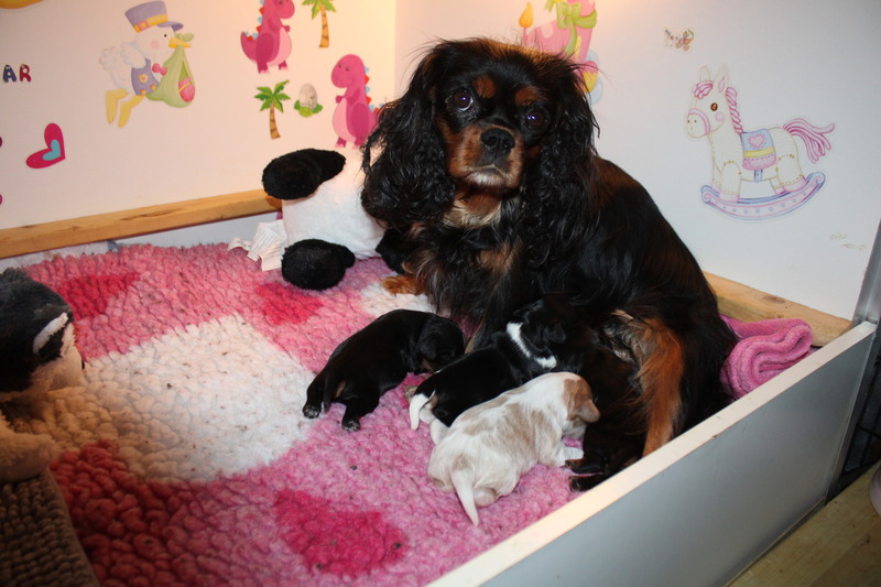 Ashton liegt auf der Wurfkiste und bewacht seine Halbgeschwister