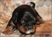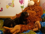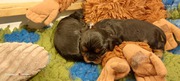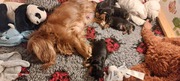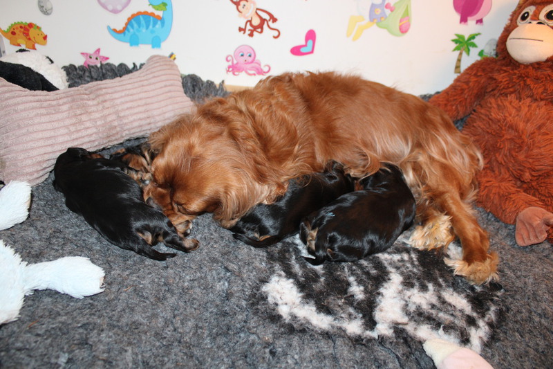 Augen hatten alle am 13 .Tag offen.Ihre Gewichte zwischen 620g/720g. Sie laufen schon stagsig durch ihr Welpenstübchen. Mama Fae buddelt sie mehrmals täglich zusammen d.h sie legt alle Kuscheltiere um oder auf die kleinen und klappt das Vetbed von rechts nach links. Etwas nervig für mich , aber sie meint es ja nur gut. Fae ist eine wundervolle Mama. Sie kommt nachts zu mir ins Bett und nimmt sich ihre kuscheleinheiten und Ruhe.Alles klappt so toll, man kann selber durch schlafen, 1x tägl. das Vetbed wechseln und 2x wiegen hat man nichts zutun.