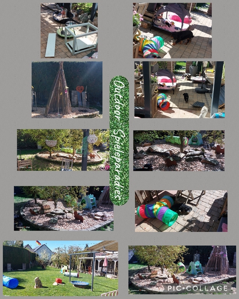 Alle spielen draußen wie auch drinnen mit so vielen Spielsachen.Draußen nutzen sie das Spielebeet.Schleppen alles an Kuscheltieren raus, toben mit den großen im Garten.