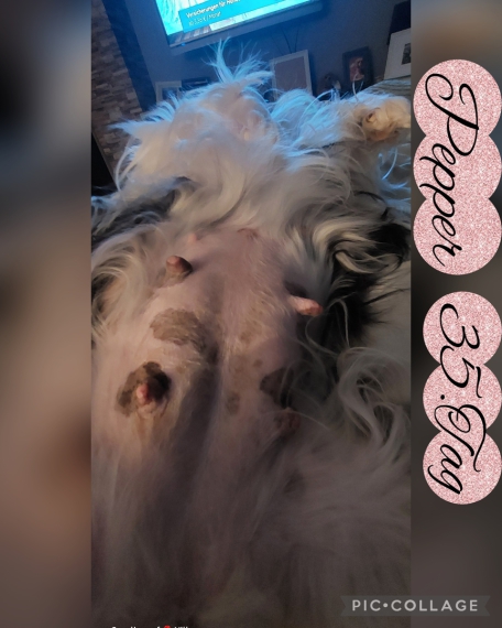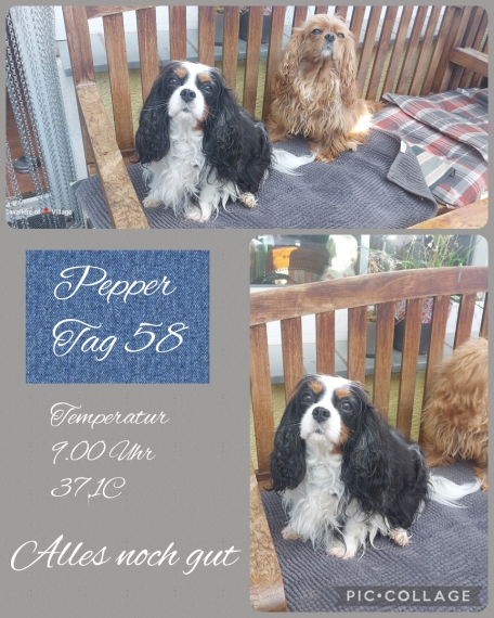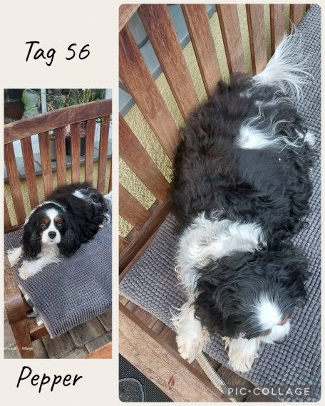 Pepper geht's sehr gut, ist immernoch überall mit dabei ,sie braucht viel Zuwendung, mag es aber nicht, das ich ihren Bauch anfassen um die Welpenbewegungen zu fühlen.Es gibt einige, die das nicht mögen.